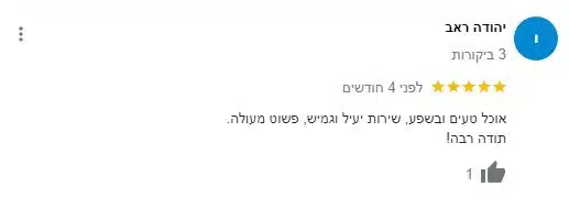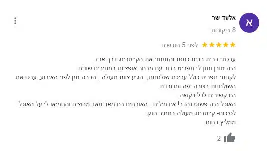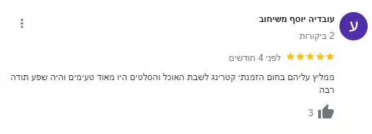 • ביקורות חיוביות: קיבלנו ביקורות חיוביות רבות מלקוחות מרוצים, המעידות על איכות השירות והאוכל שלנו.